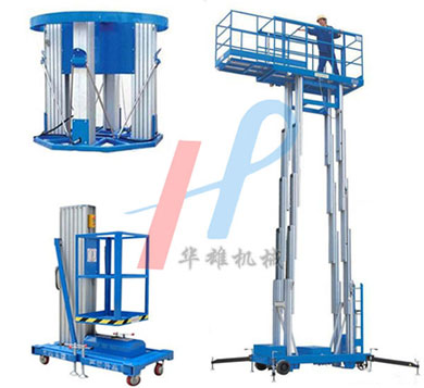 單桅鋁合金升降機(jī)是由單桅柱支撐作業(yè)平臺,是起初出現(xiàn)的鋁合金升降機(jī)。具有升降平衡,操作方便等優(yōu)點(diǎn)能,可隨意進(jìn)出電梯且耗電少、無污染、工作時不傷 地面,可用于貼墻工作及探出作業(yè),工作無死角等優(yōu)點(diǎn)。雙桅鋁合金升降機(jī)整體采用高強(qiáng)度鋁型材精制而成由于型材強(qiáng)度高,使升降臺的偏轉(zhuǎn)與擺動極小。采用雙桅柱式結(jié)構(gòu),載重量大,平臺面積大,穩(wěn)定性極好,運(yùn)轉(zhuǎn)靈活,推行方便。 三桅鋁合金升降機(jī)由三組桅柱支撐作業(yè)平臺同步升降,支腿結(jié)構(gòu)同單桅柱式平臺,具有超大的載重量和優(yōu)秀的工作穩(wěn)定性。四桅鋁合金升降機(jī)整體采用高強(qiáng)度鋁型材精制而成由于型材強(qiáng)度高,采用四桅柱式結(jié)構(gòu),穩(wěn)定性極好,運(yùn)轉(zhuǎn)靈活,載重量大,平臺面積大,推行更方便。
